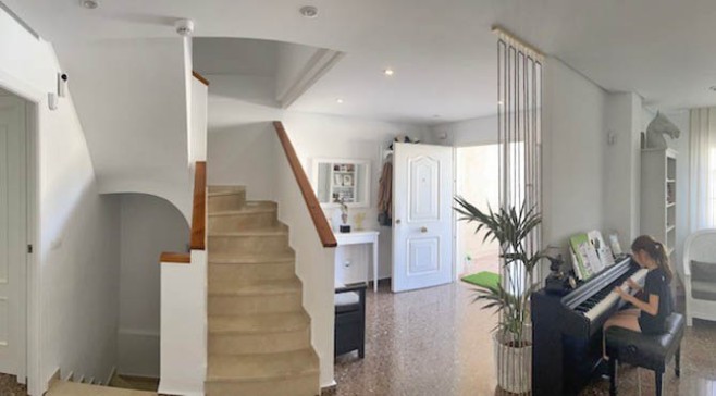 It has a large living room, the kitchen is open to the living room. It has a reading corner and where you can also play the piano.