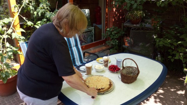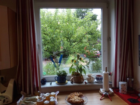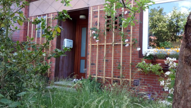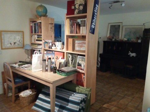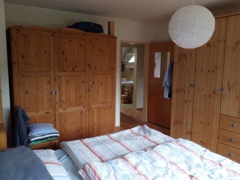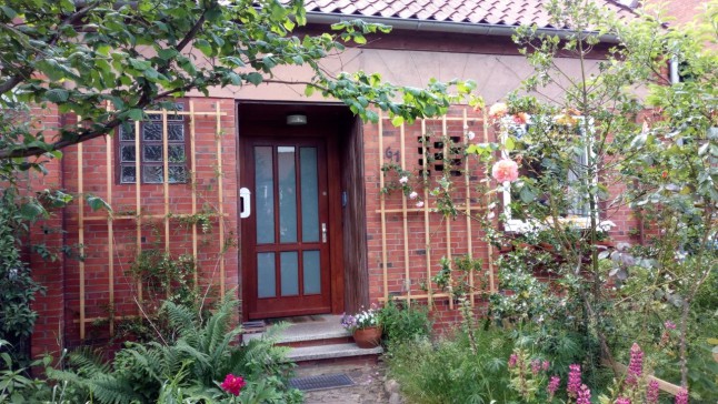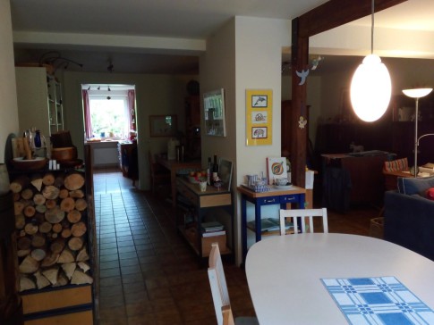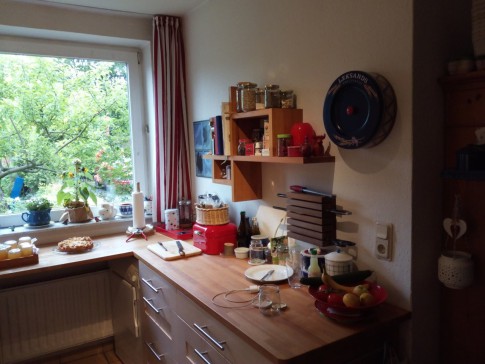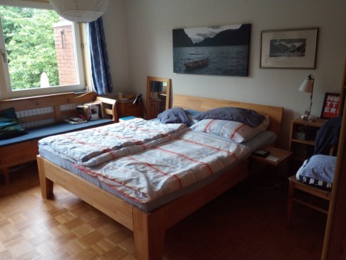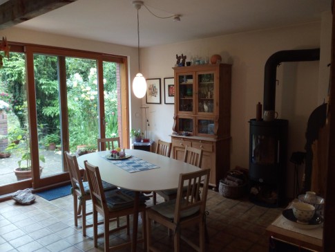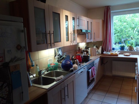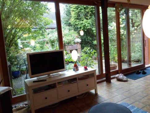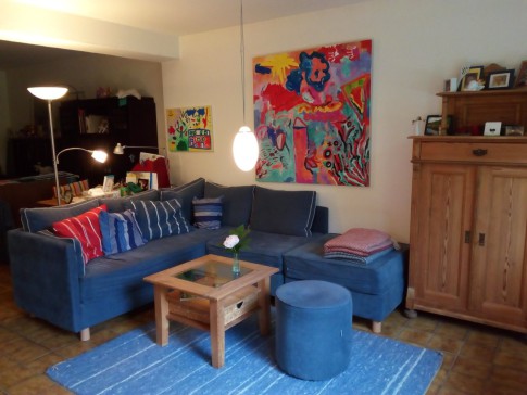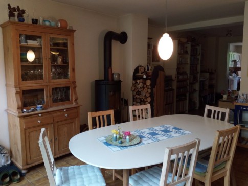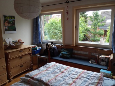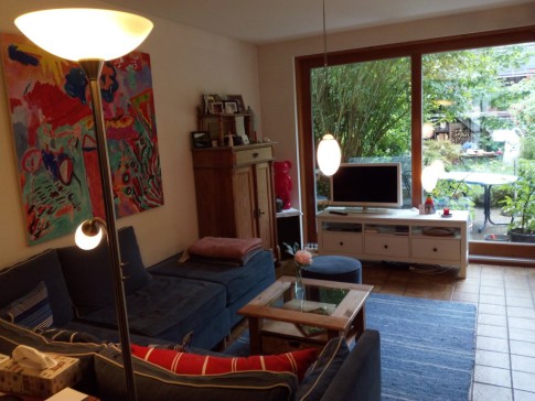 We live in a terassed house with a large livingroom, 3 bedrooms (1st floor) and two baths. The livingroom has large windows (1 sliding) with access to terrace and garden. The house ist located at the end of a quiet dead-end-street.
