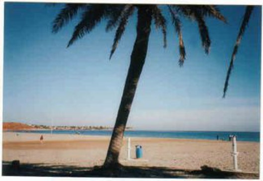 Our villa is situated in a very quiet mature area of pine and palm trees.We have uninterrupted views from the front of the property over lemon groves,mountains,lakes and the Mediterranean sea.It is a five minute car ride to the beach in the photograph and also 3 golf courses.The village of San Miguel is typically Spanish and has all amenities.There is a very unusual restaurant "Las Cuevas" which has been made from the original cave homes in the village.There is a weekly outdoor market.The area is very colourful in winter due to the large amount of orange groves in the area and in summer the sky is lit up with the fireworks from the many fiestas being celebrated.The surrounding area is multinational and there are restaurants to suit all tastes.Nearby Torrievieja has a lovely promenade and marina and the beaches have won awards for cleanliness.