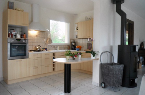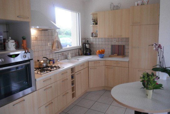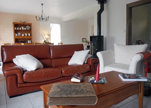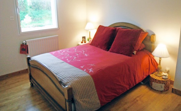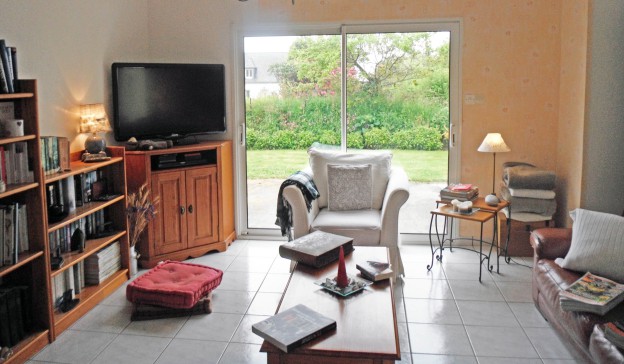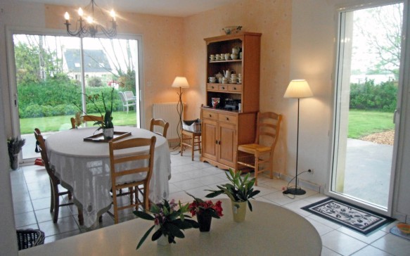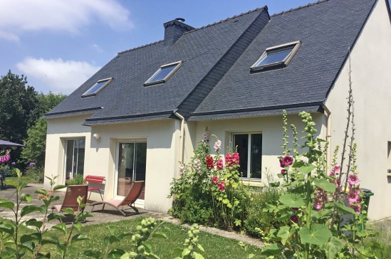 Comfortable house located in a small hamlet in the countryside, yet close to the sea, and surrounded by a large leafy garden. The house comprises a large living room with an en-suite kitchen, two double bedrooms and a bathroom on the ground floor (there`s another bedroom with 2 single beds in the attic). The living room opens onto a south facing terrace with outside furniture, sunbeds and barbecue.