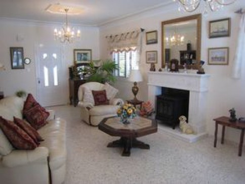 We have a large comfortable lounge with TV and DVD, fireplace with gas log effect fire inset, kitchen/dining room; the kitchen has washing machine, dish washer, fridge freezer, microwave, all the usual appliances. We have another room in which we have the computer and printer plus the piano, and another table and chairs and we use it as a breakfast room come study, and that opens out onto the tiled patio area around the swimming pool, where we have outside seating and dining furniture plus a barbecue area.