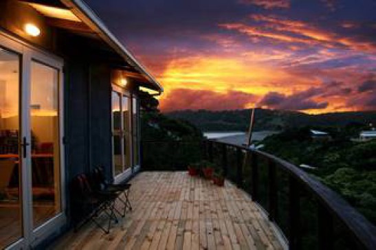 North West facing gives all day sunshine and fabulous sunsets. The house is on a steeply sloping plot with extensive views over the bushed valley towards the bay.