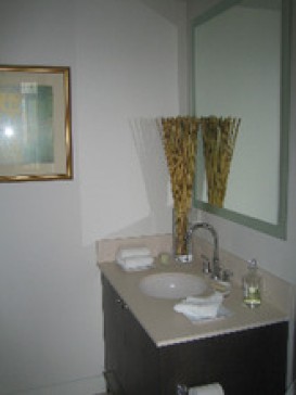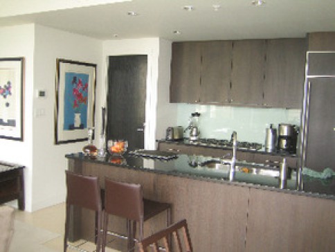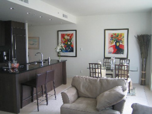 Our home has a well equipped open plan kitchen, granite counters and dark wood cabinetry. There are two bedrooms and bathrooms each with dark cabinets and limestone counters. The living/dining room is bright and spacious and there is a small office.