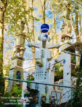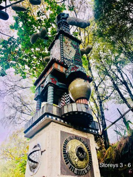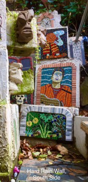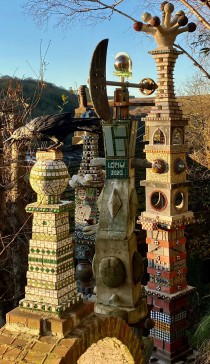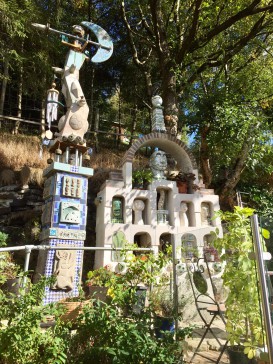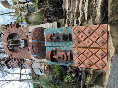 There is a small west-facing terrace at the front of the house, To the rear, there is a steep garden featuring monumental sculptures. There is a small terrace with chairs and a table.