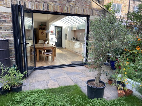 Our Victorian end-of-terrace is in a vibrant, diverse part of London. It has a recently refurbed, very large, glass-roofed kitchen which is bathed in light & opens out onto a small sunny garden with a `pizza bar`, table and chairs and fire pit. Downstairs there is also a shower room (with toilet), a laundry room, a study (with a double sofa bed) and a comfy lounge which is home to plenty of instruments, including a piano.