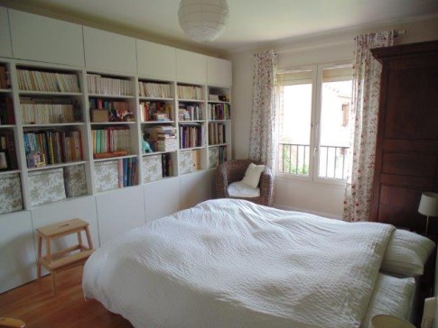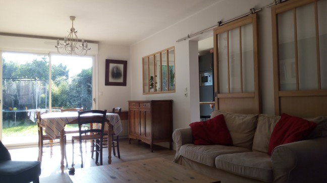 Living room and kitchen open on the garden (and WC at that floor). At the first floor, bathroom with a shower (no tub), 2 bedrooms + an office and at the second floor, a large bedroom under the roof.