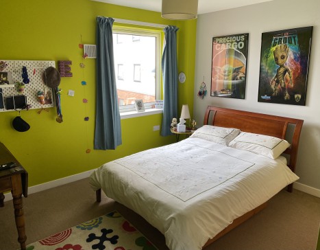 Large kid's bedroom with very comfortable bed and fitted wardrobes.