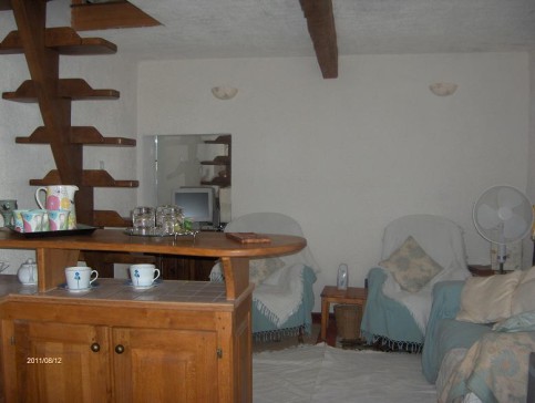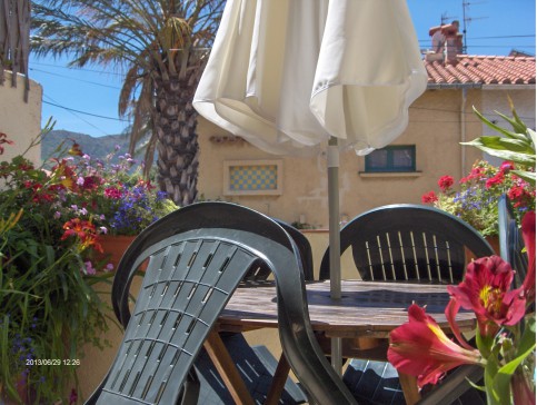 A small house in the seaside town of Banyuls sur Mer. 3 floors: Ground floor, storage and spare room. First Floor: terrace, open plan kitchen and living room. Second Floor: double bedroom, toilet, shower, hand basin and then mezzanine with two single beds. The house has one face, south to the mountains . The other three faces/sides are butted to another house on each side. A modest house, but clean and comfortable. Suitable for two grown ups and OK for four but you may find it a little crowded if you are used to living in a larger home.