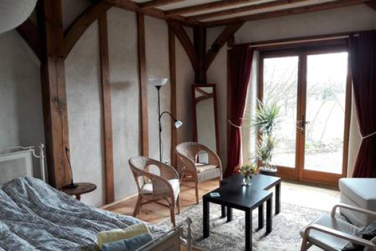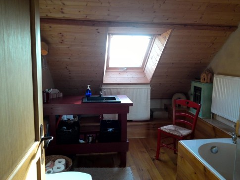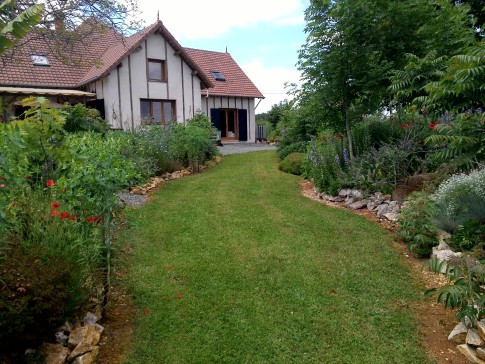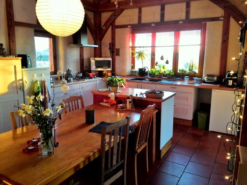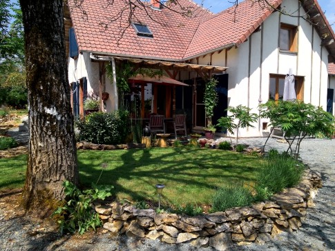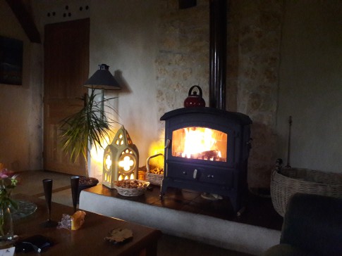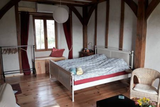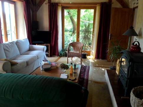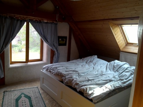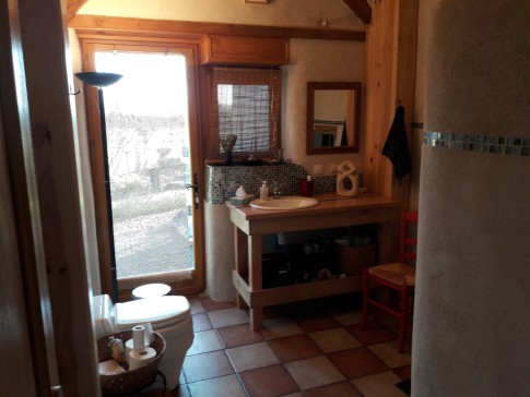 Our home is a characterful eco (straw bale) house  - we have done a large part of the construction ourselves. It has beautiful lime rendered walls and a relaxed ambiance with a beautiful garden surrounded by countryside views. It has a covered terrace with table and chairs for al fresco dining.