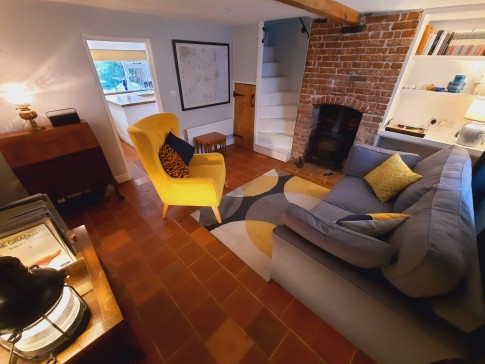 Sitting Room: Seating for 4 people, with log burner, bureau/desk and side tables. The shelves have a selection of books on the local area, architecture and some children's books.