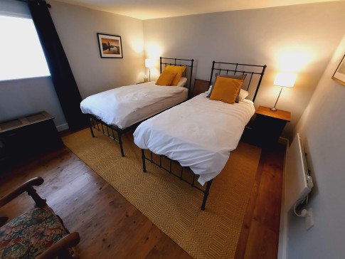 Bedroom 1: 2 single beds, wardrobe storage (Includes iron and ironing board), drawers, side tables.