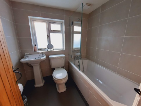 Bathroom: WC, basin and bath, with shower attachment and screen. Heated towel rail and extractor fan.