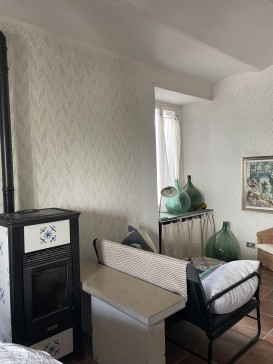Heating is with pellet- and wood stoves. The smaller bedroom is without own heating (i.e. only through open door).