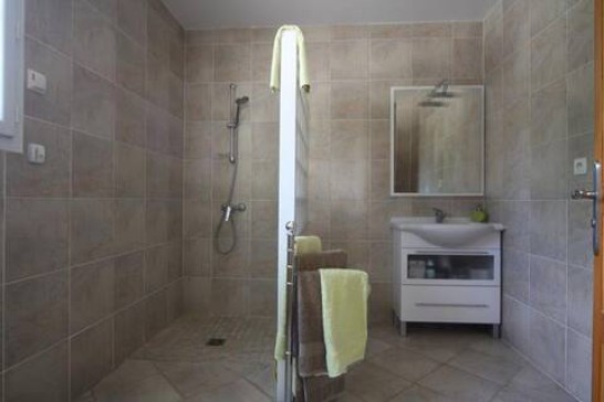 A flight of stairs leads down from the entrance hall to the garden level. There is a kitchen (12m2) with a range of fitted units and a glazed door to a covered patio (with great views). To the side of the kitchen are a bedroom (16m2) and a shower room (shower, wash-basin and WC).
