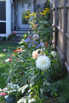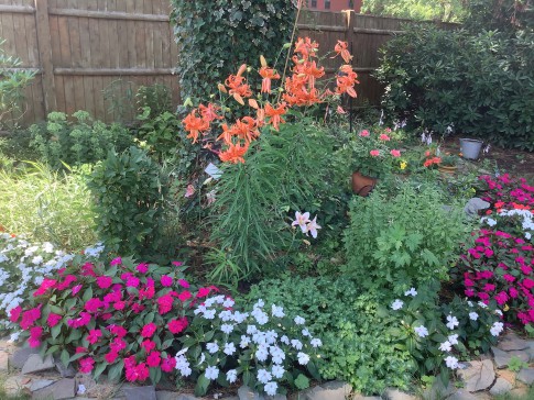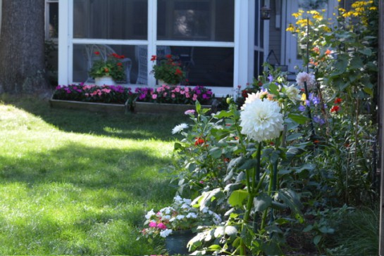 The back yard is a lovely area plenty big enough for a croquet match surrounded by numerous flowering plants and shrubs.