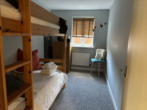 One master bedroom with double bed, second bedroom comes with top bunk by default but desk converts to a second, lower bunk, travel cot and high chair also available if you need.