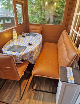 The newly refurbished kitchen is equipped with everything you need for an easy self-catering holiday. There is a versatile Ninja Dual Foodi, a microwave, toaster, kettle, compact fridge-freezer, bean- to- cup coffee machine, dual rapid halogen hob, and a slimline integrated dishwasher. There is also a small but efficient washing machine and an electric drying rail available in the internal verandah. There is an outdoor washing line. There is a laundrette on site for larger washloads.